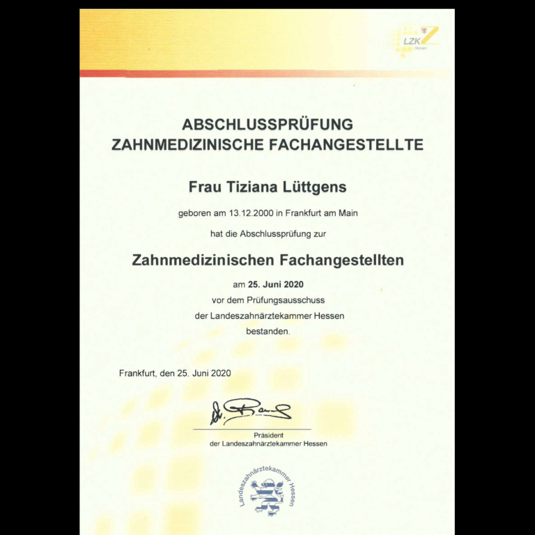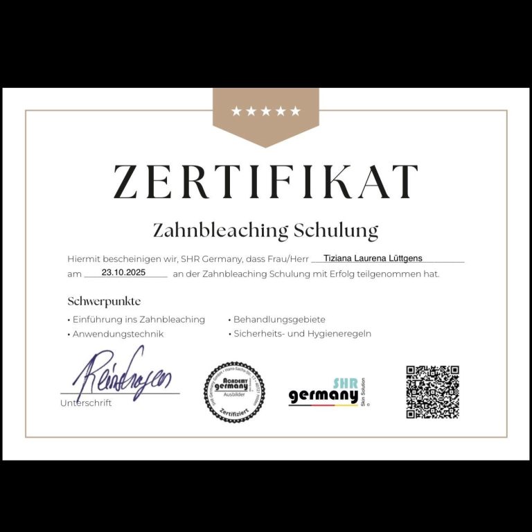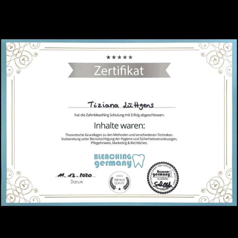 Neben meiner Ausbildung zur Zahnmedizinischen Fachangestellten habe ich zusätzlich Zertifikate im kosmetischen Bleaching